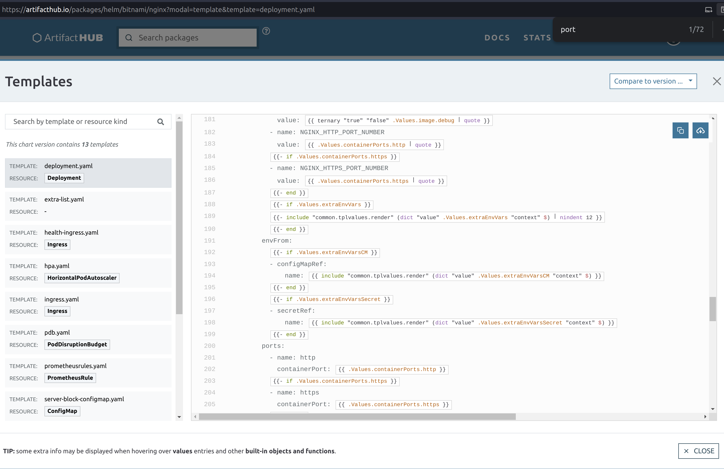 By looking at the binami URL entry for nginx, we can look at the different configuration templates included in the Helm chart.
